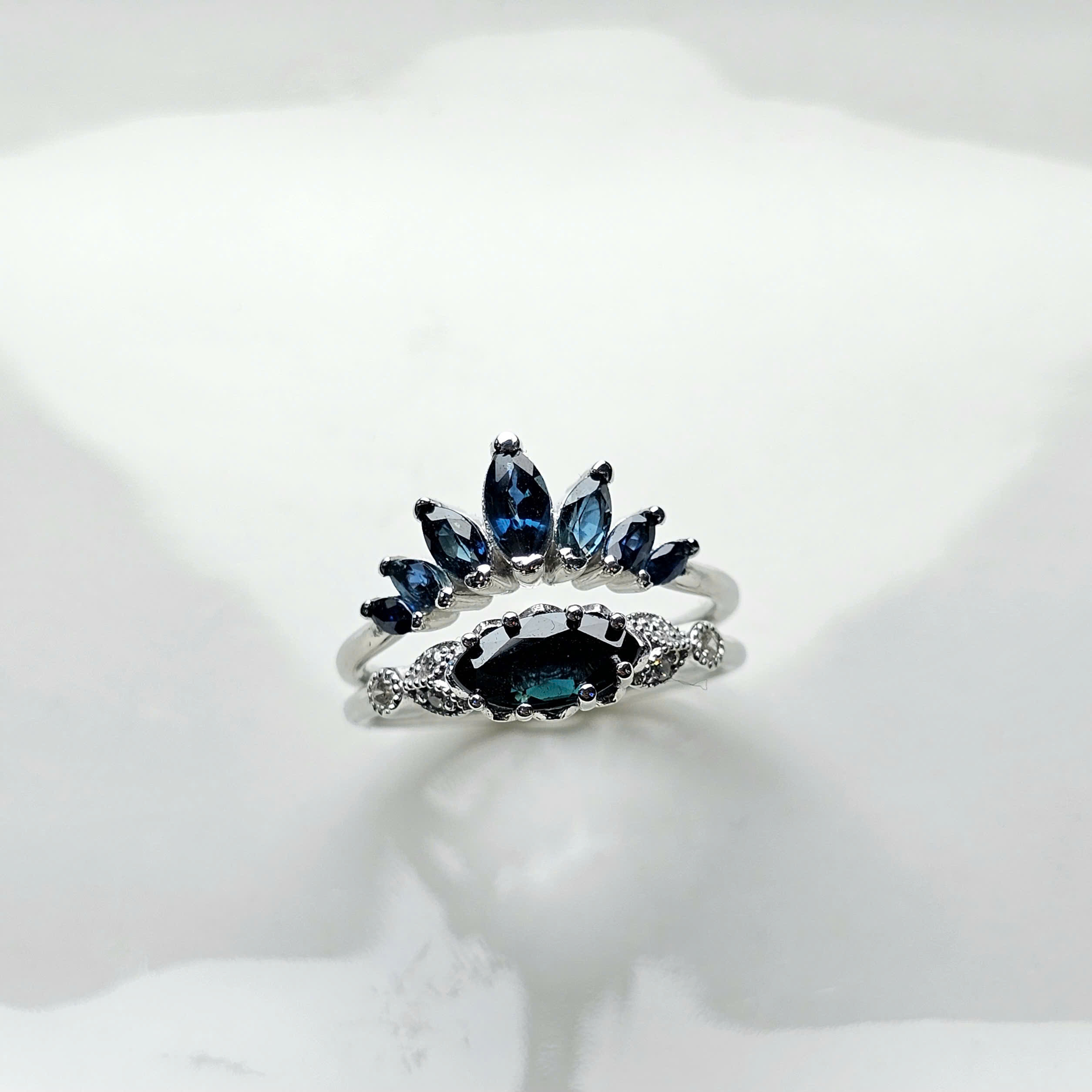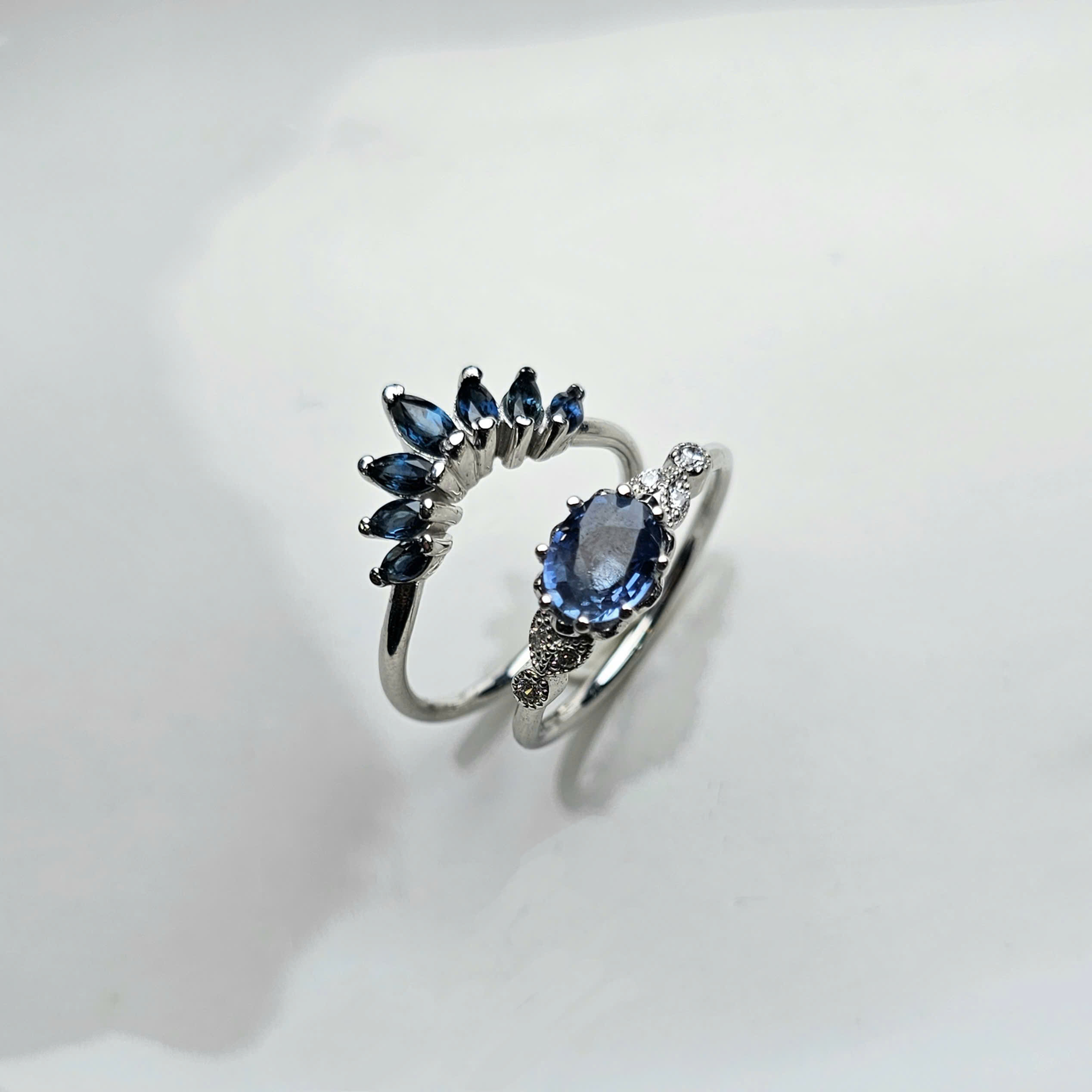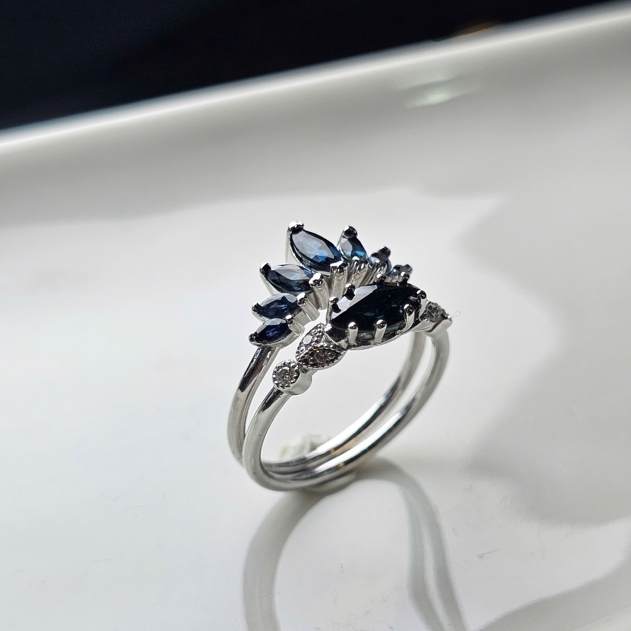 Cặp nhẫn Sapphire bạc. Có thể deo tách riêng từng chiếc hoặc đeo cả cặp. Một sự kết hợp từ đơn giản thành thành điệu đà, lộng lẫy. Có thể chỉnh size nhẫn.