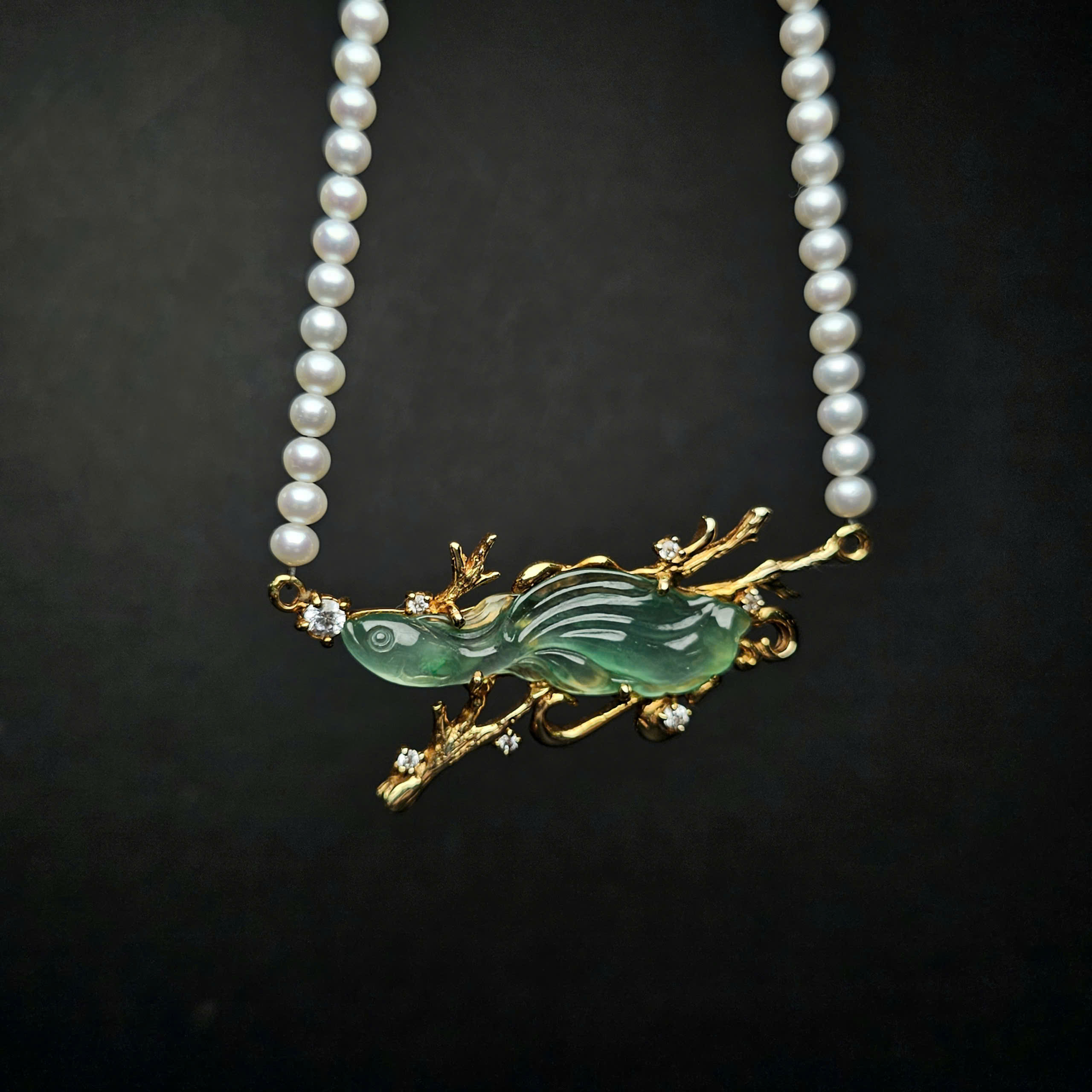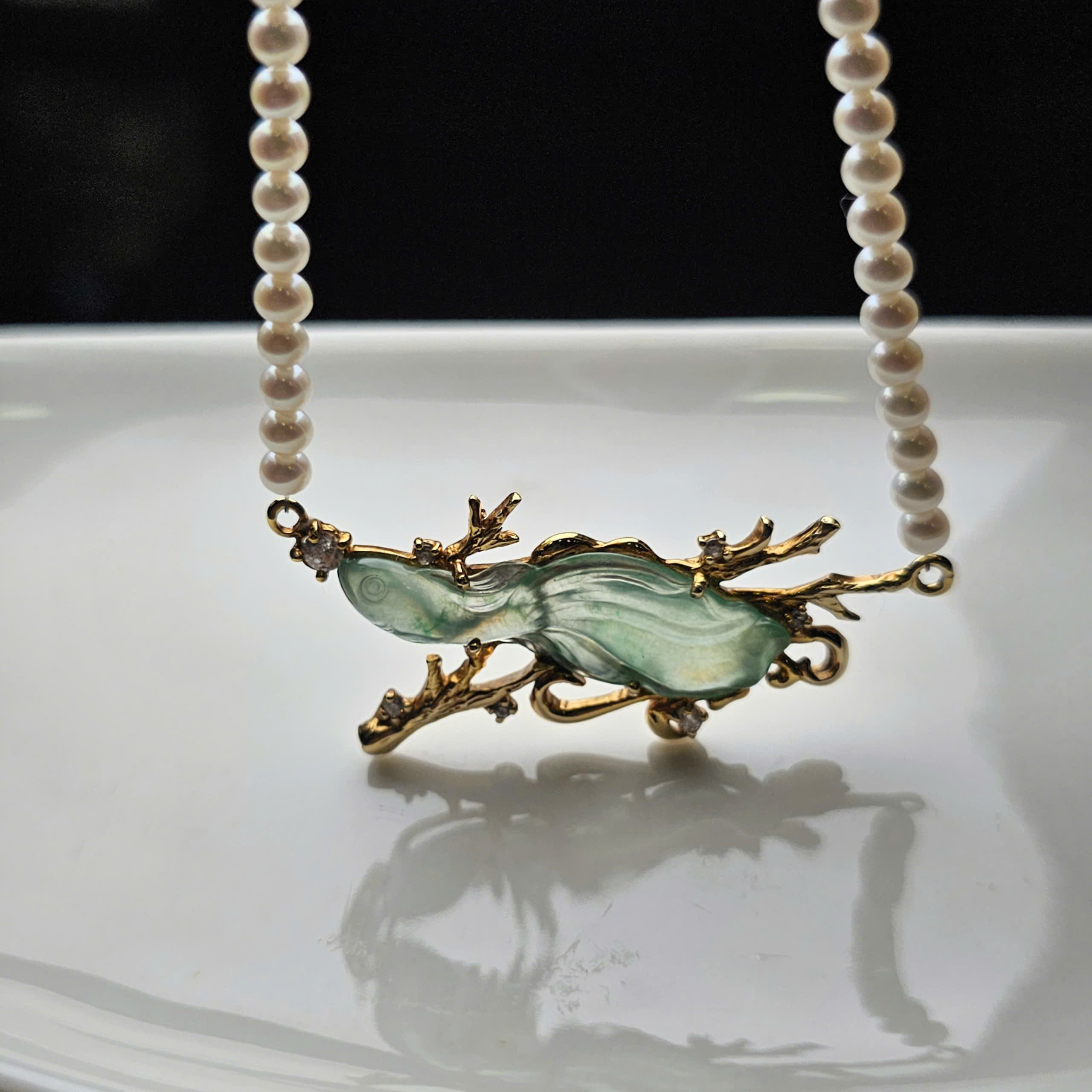 Chuỗi cổ cá ngọc Jadeite type A chất băng mix ngọc trai nước ngọt, mặt cá khung vàng 10k.