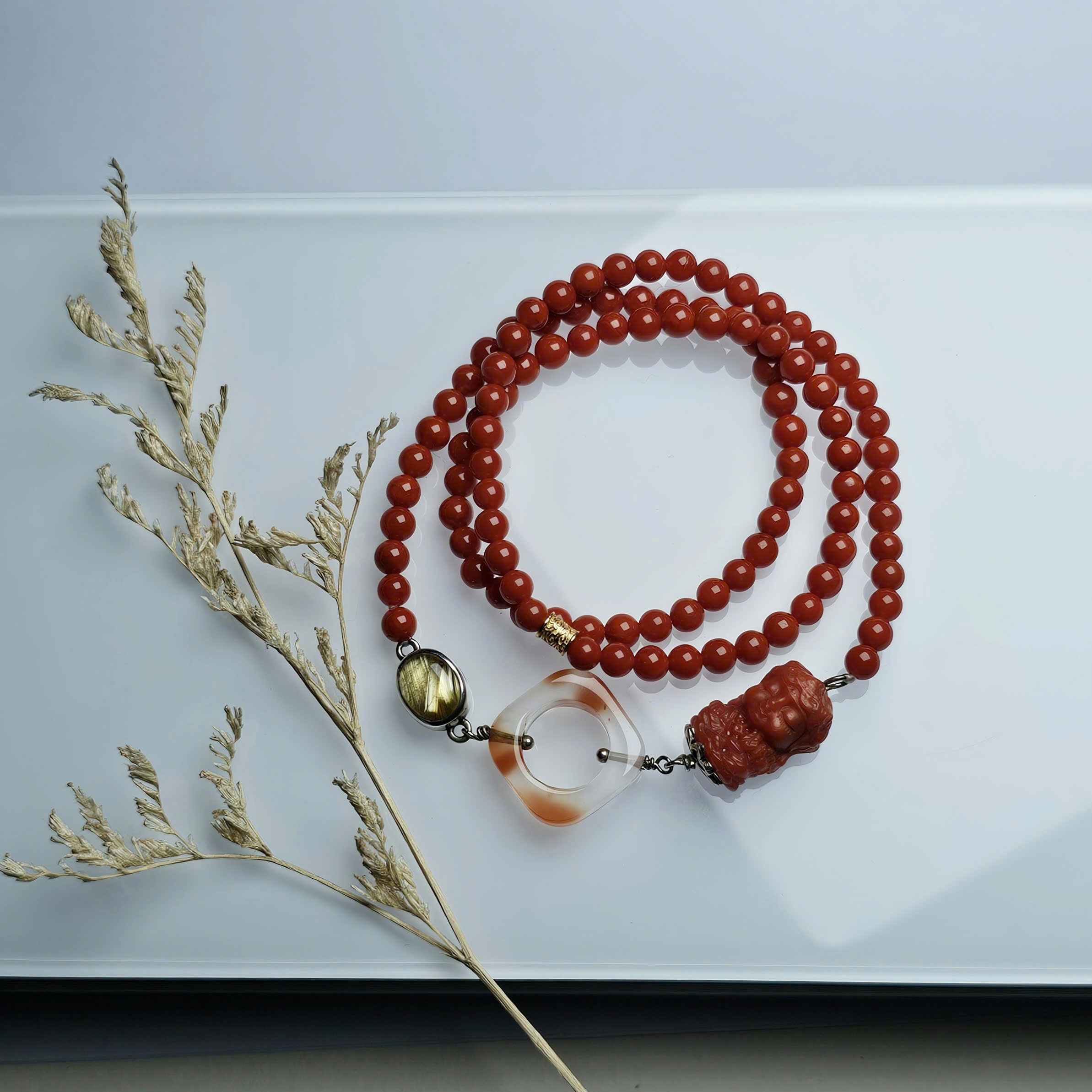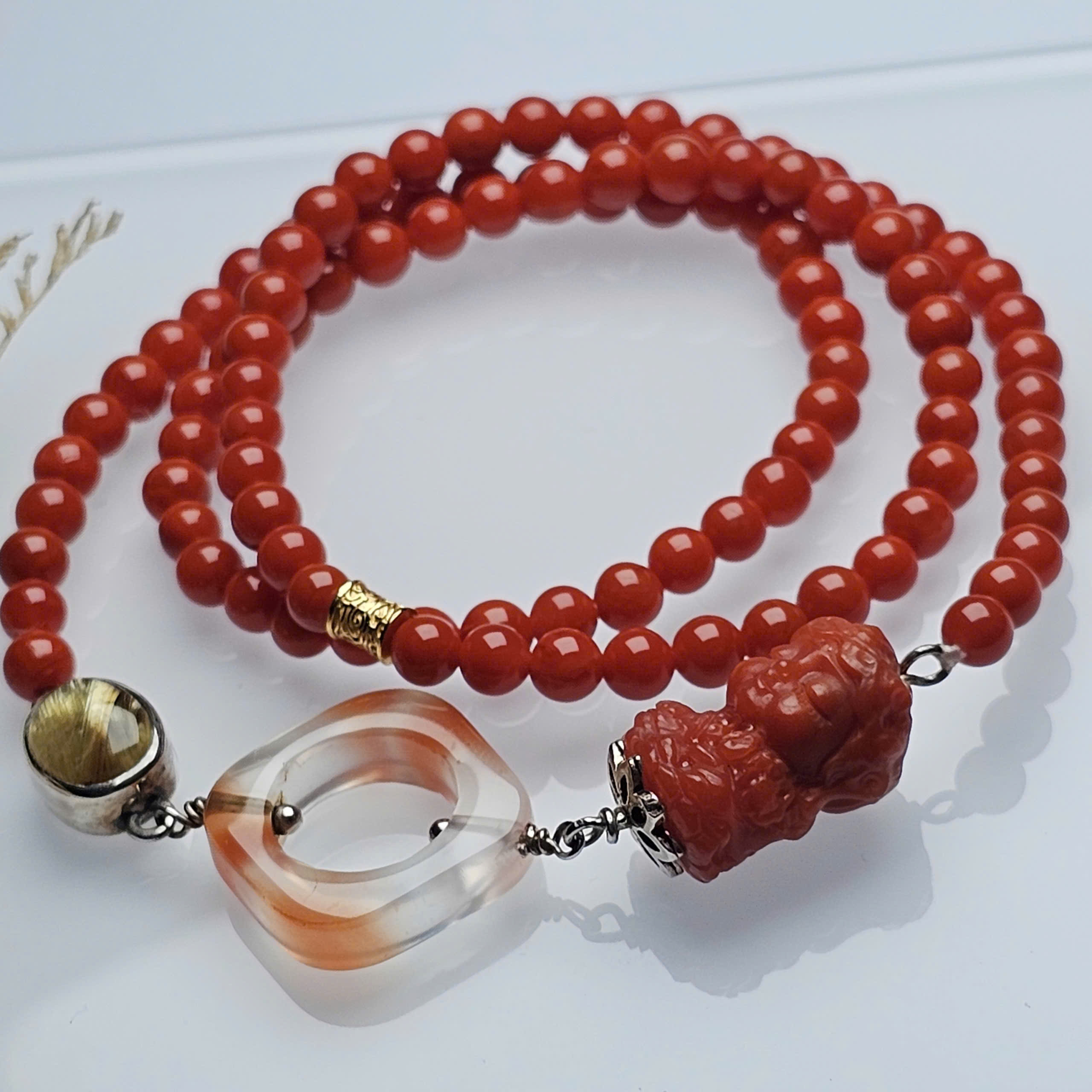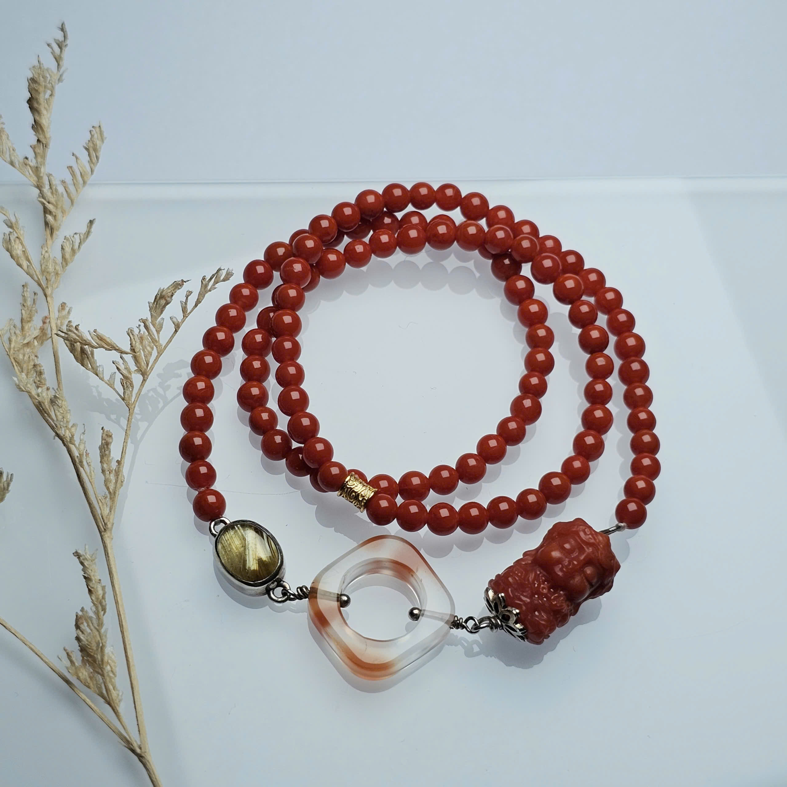 Chuỗi Nam Hồng đỏ đặc nhí mix Tara, khấu nam hồng hoa bay và charm thạch anh tóc vàng, điểm xuyết charm bạc mạ vàng.
