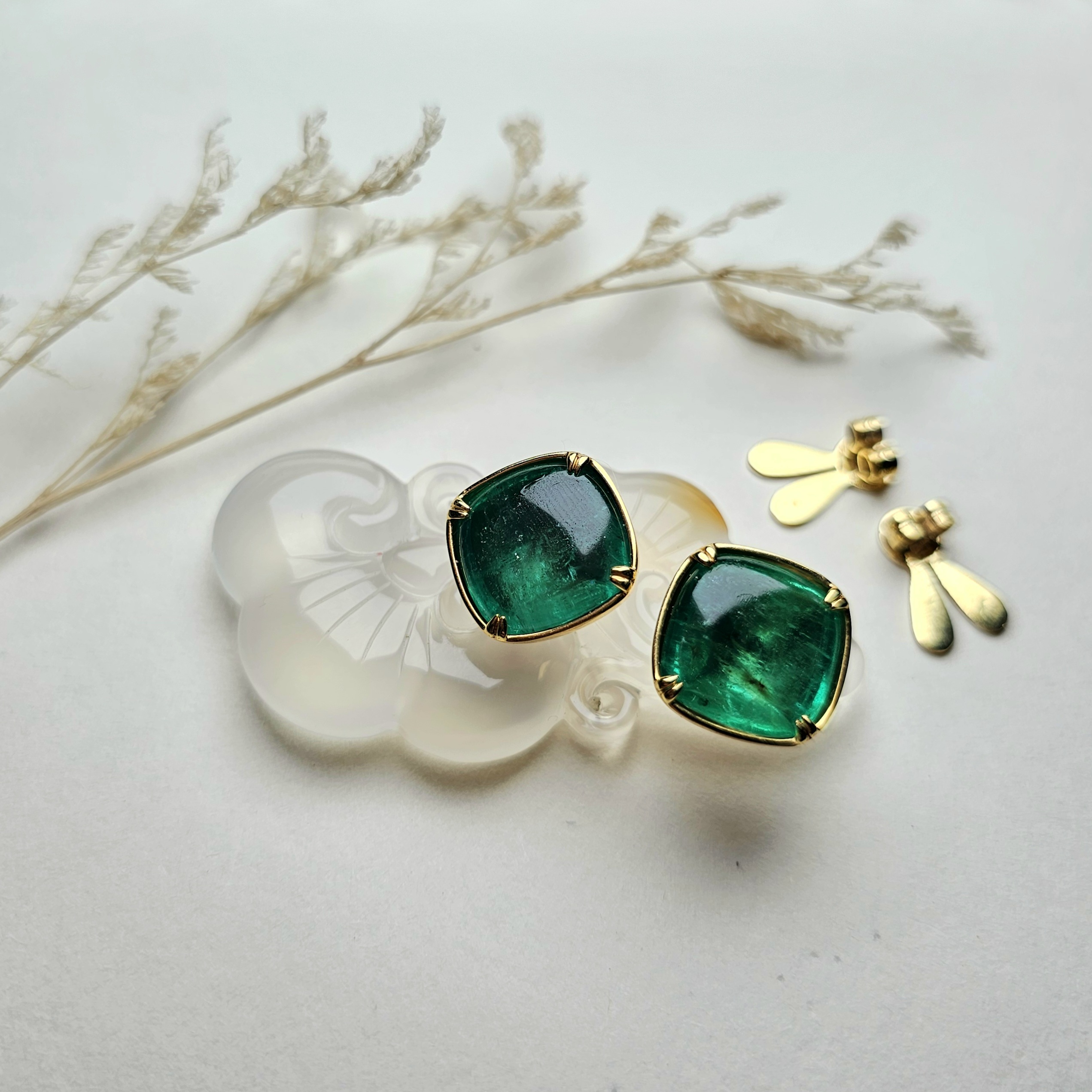 Đắm mình trong vẻ đẹp nguyên sơ, lộng lẫy của emerald tự nhiên với đôi khuyên tai kinh điển từ Lajew. Tâm điểm tuyệt đối là cặp emerald giác cắt cabochon với kích thước vô cùng ấn tượng, tổng trọng lượng lên đến 17.7 carat. Mỗi viên đá phô diễn trọn vẹn sắc xanh lục bảo huyền thoại, sâu thẳm và đầy cuốn hút, có thể ẩn chứa những đường vân “jardin” tự nhiên độc đáo – một minh chứng quyến rũ cho nguồn gốc thiên nhiên thuần khiết.