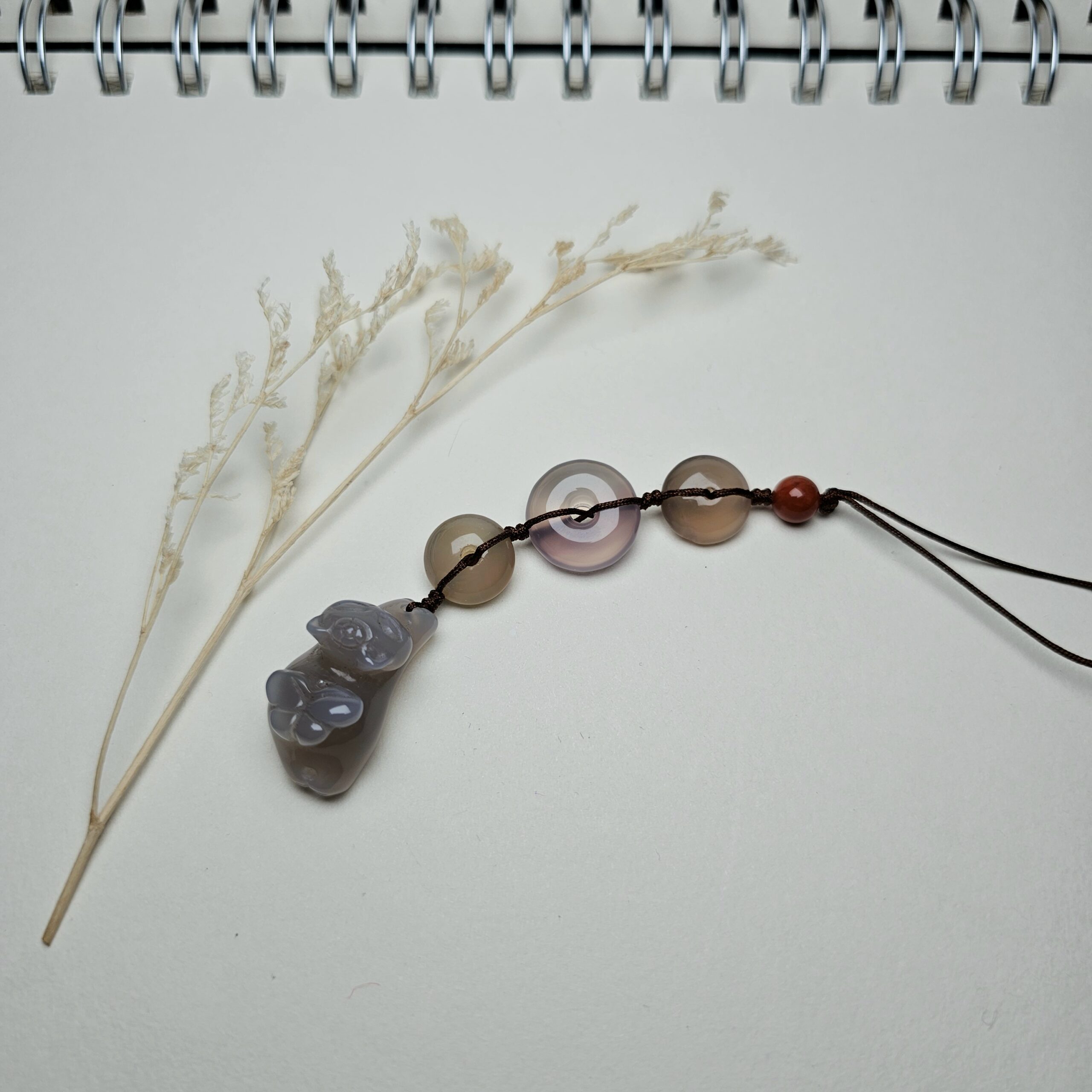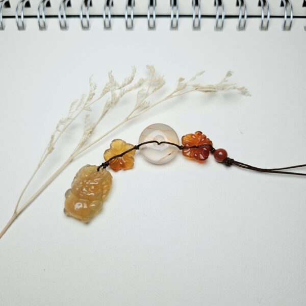 Thêm nét duyên tinh tế và một chút bình an cho chiếc điện thoại (hoặc túi xách, chìa khóa…) của bạn với móc treo được chế tác thủ công từ đá mã não tự nhiên đa sắc của Lajew. Thiết kế là sự kết hợp hài hòa của các loại hạt mã não khác nhau: những hạt tròn màu nâu xám trầm ấm, một hạt tròn nhỏ màu đỏ nâu làm điểm nhấn, và đặc biệt là hạt mã não tròn dẹt với những đường vân sọc đồng tâm vô cùng độc đáo và đẹp mắt.