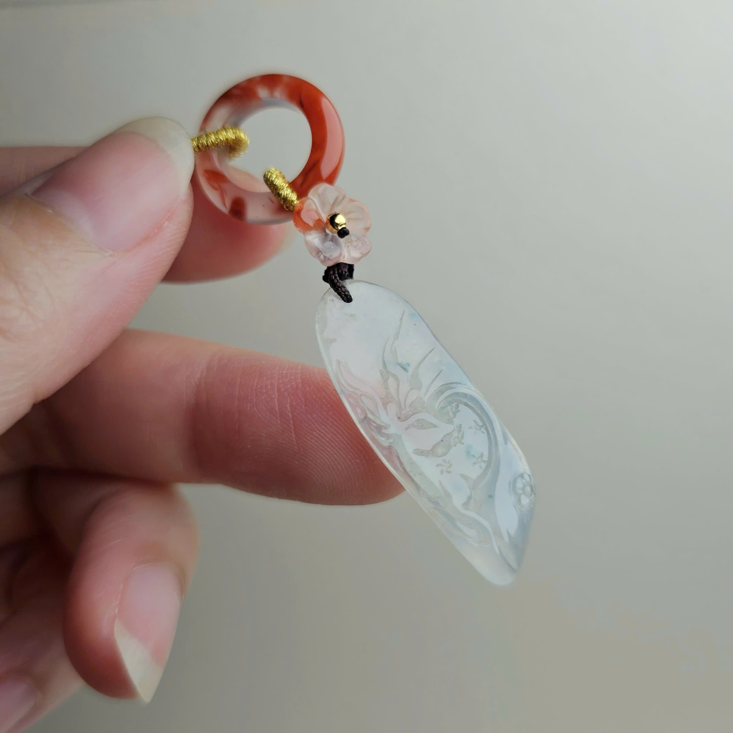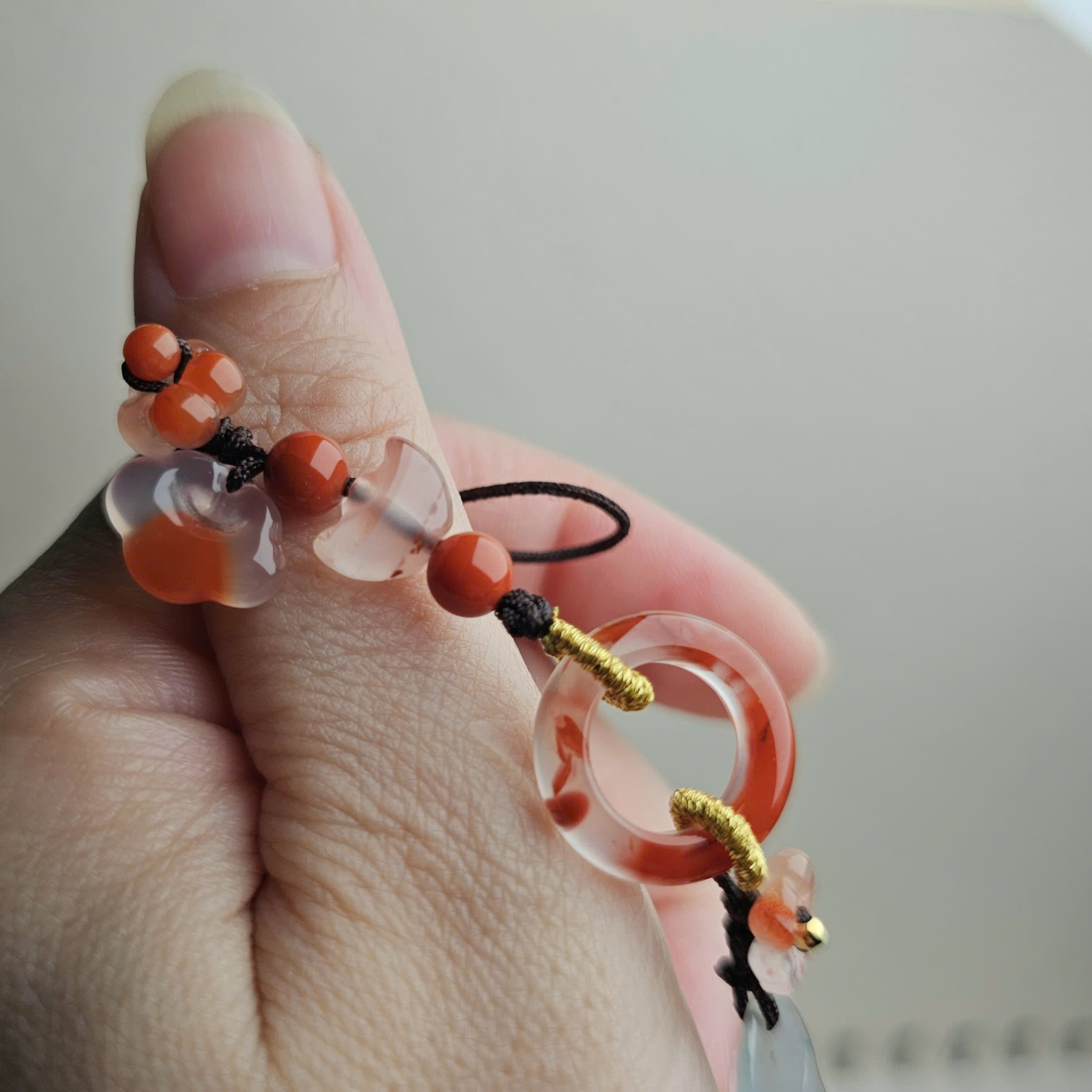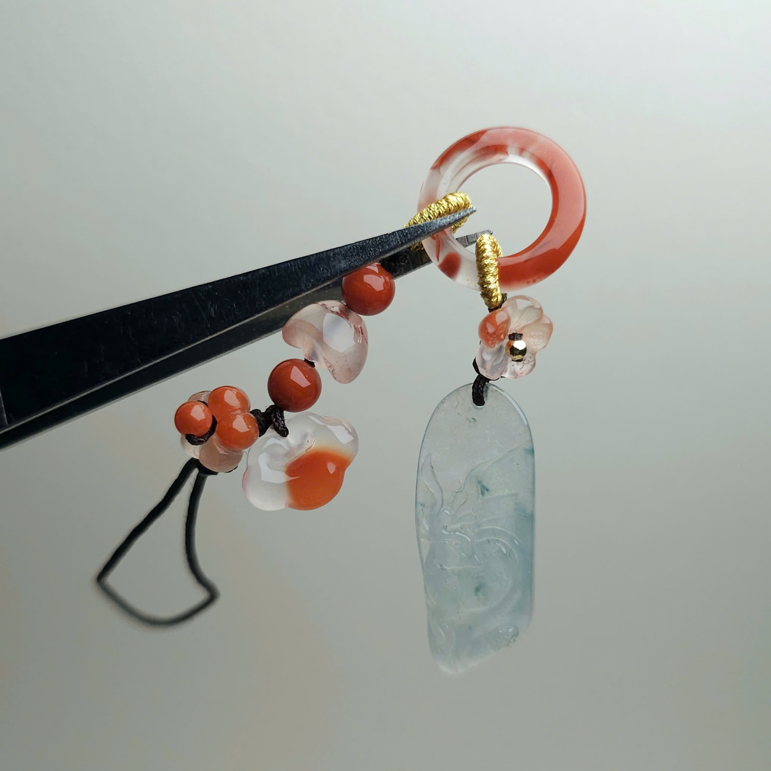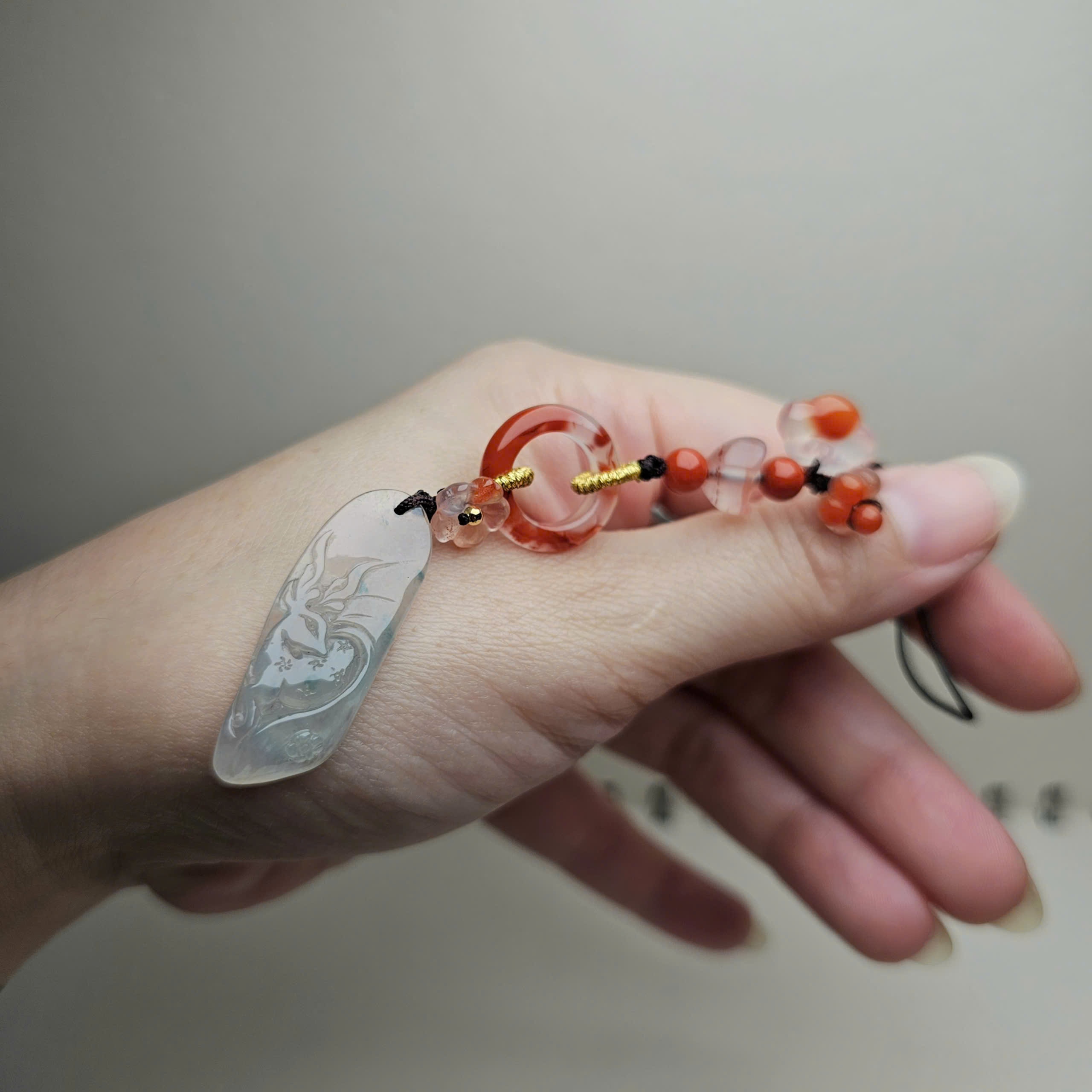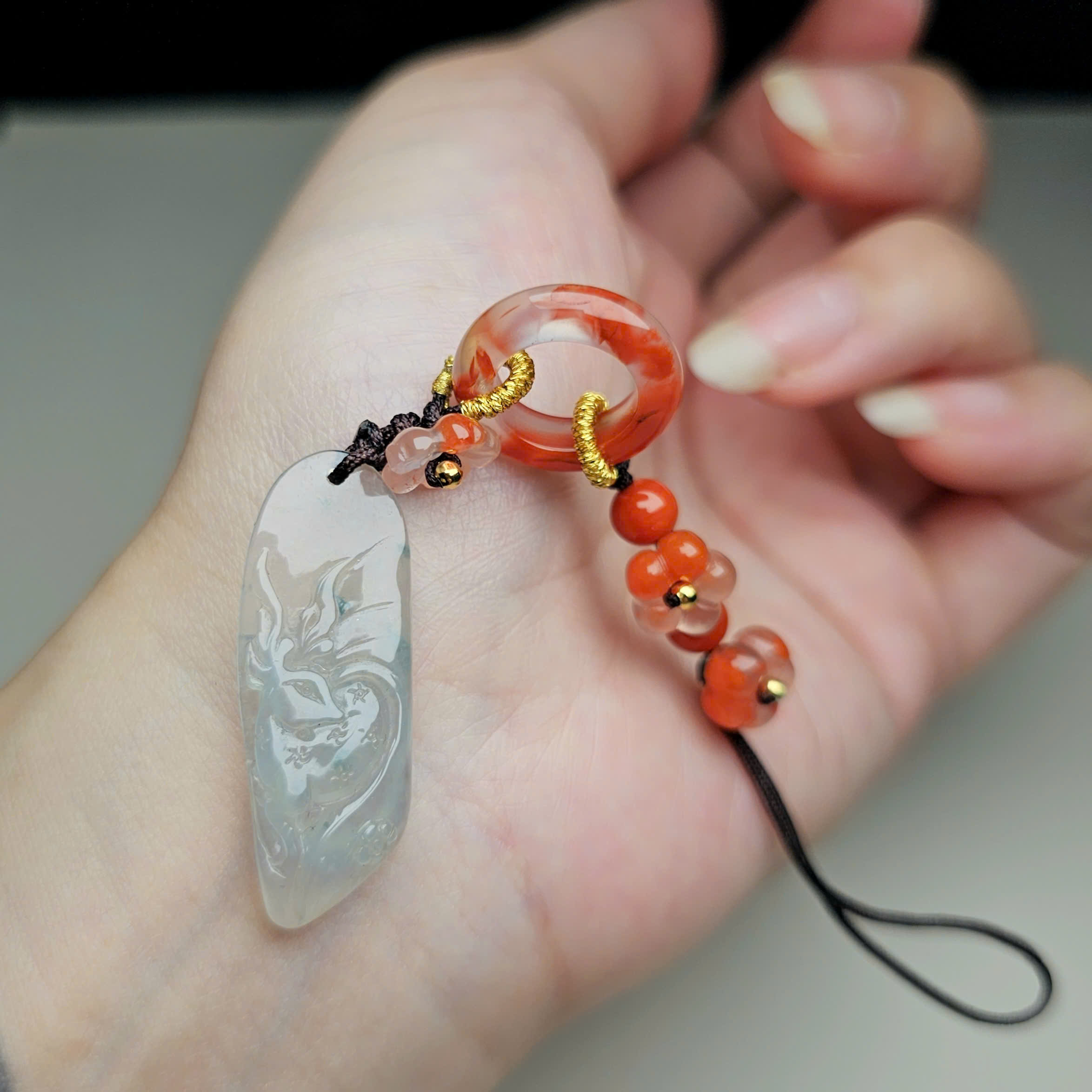 Móc treo hươu ngọc jadeite type A và khấu Nam hồng. Hươu là biểu tượng cho tài lộc, trường thọ, sức khỏe, sung túc. Có thể chuyển thành móc treo túi.