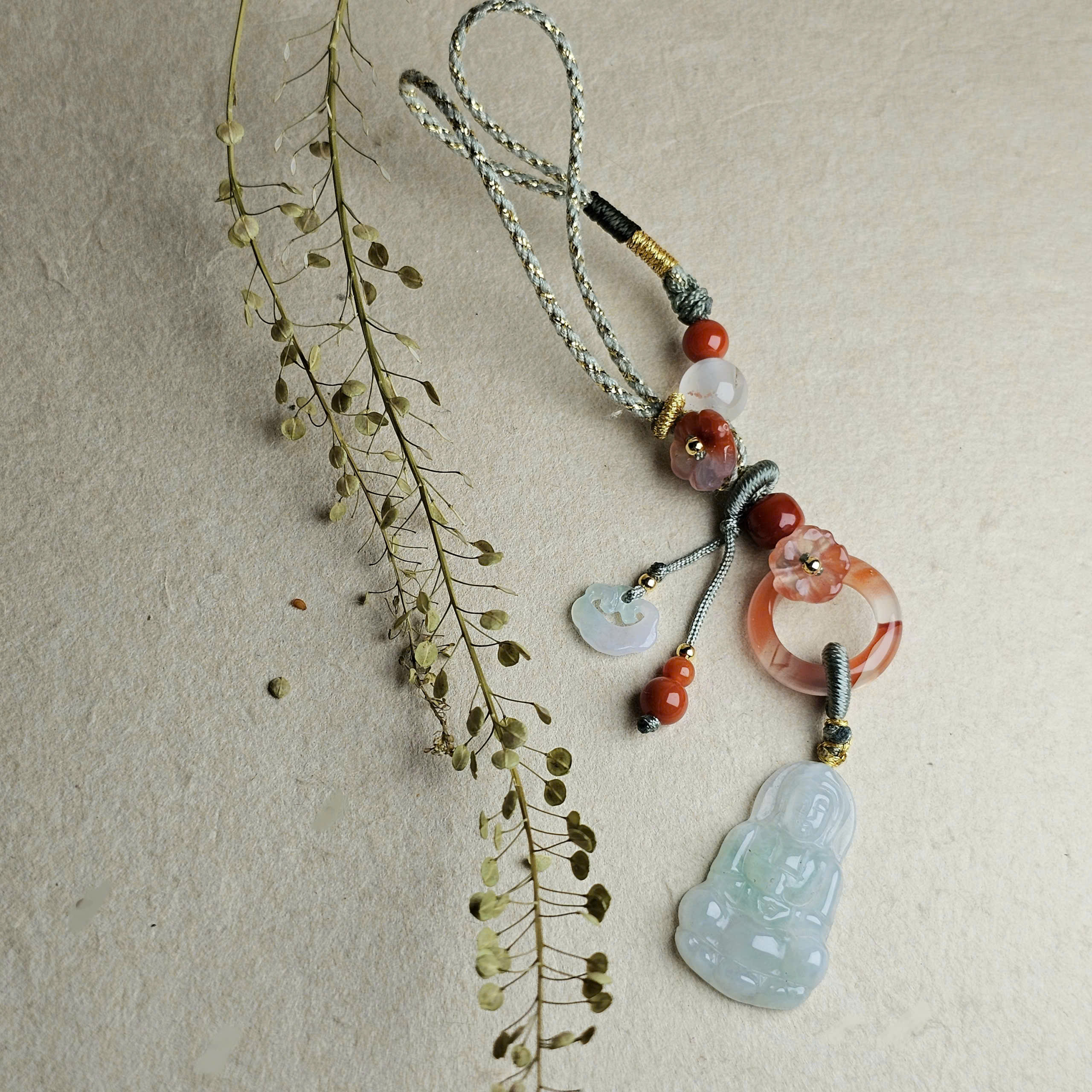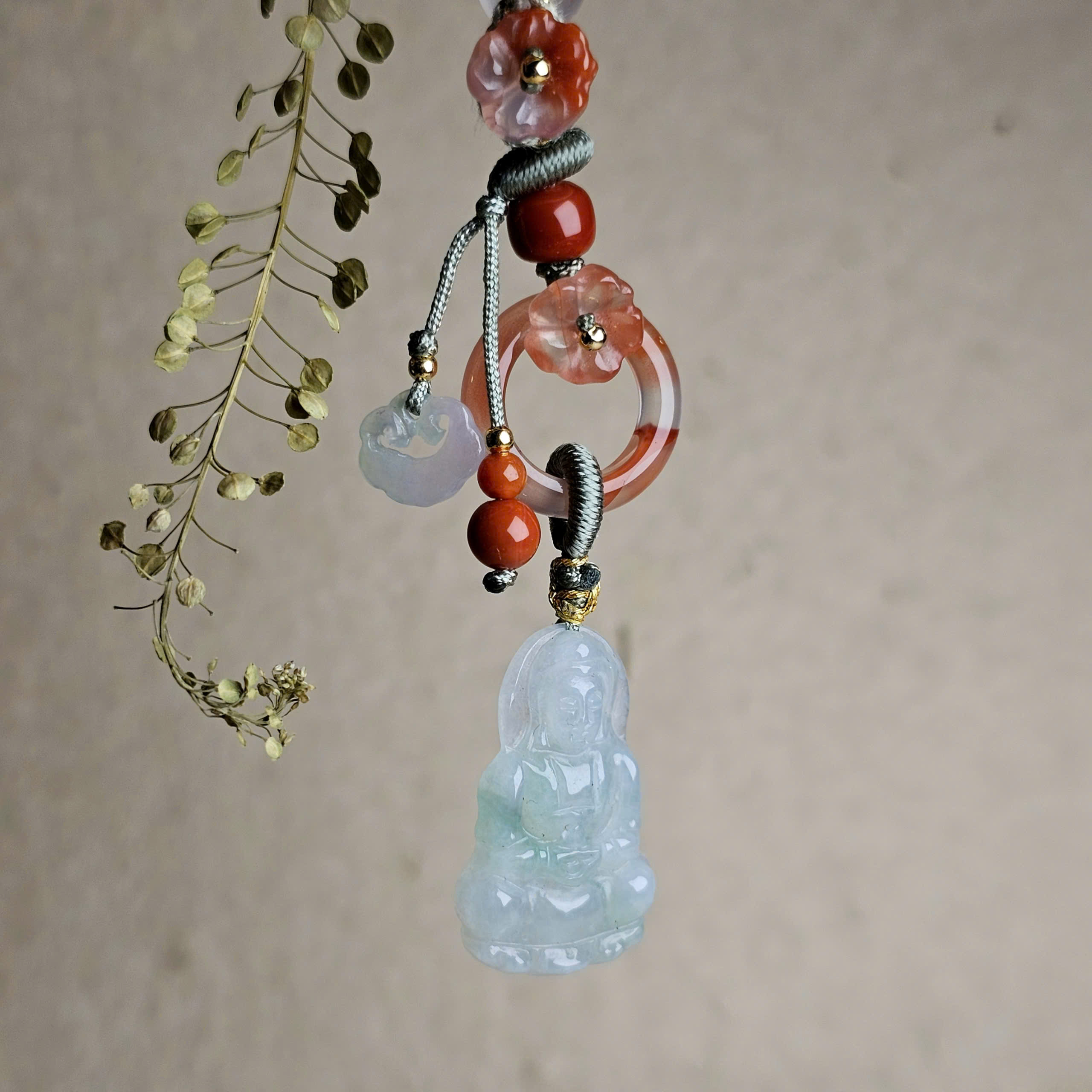 Móc treo túi phật và khóa trường mệnh Ngọc Jadeite type A mix khấu bình an, hoa Nam hồng. Có thể chuyển thành dây treo điện thoại