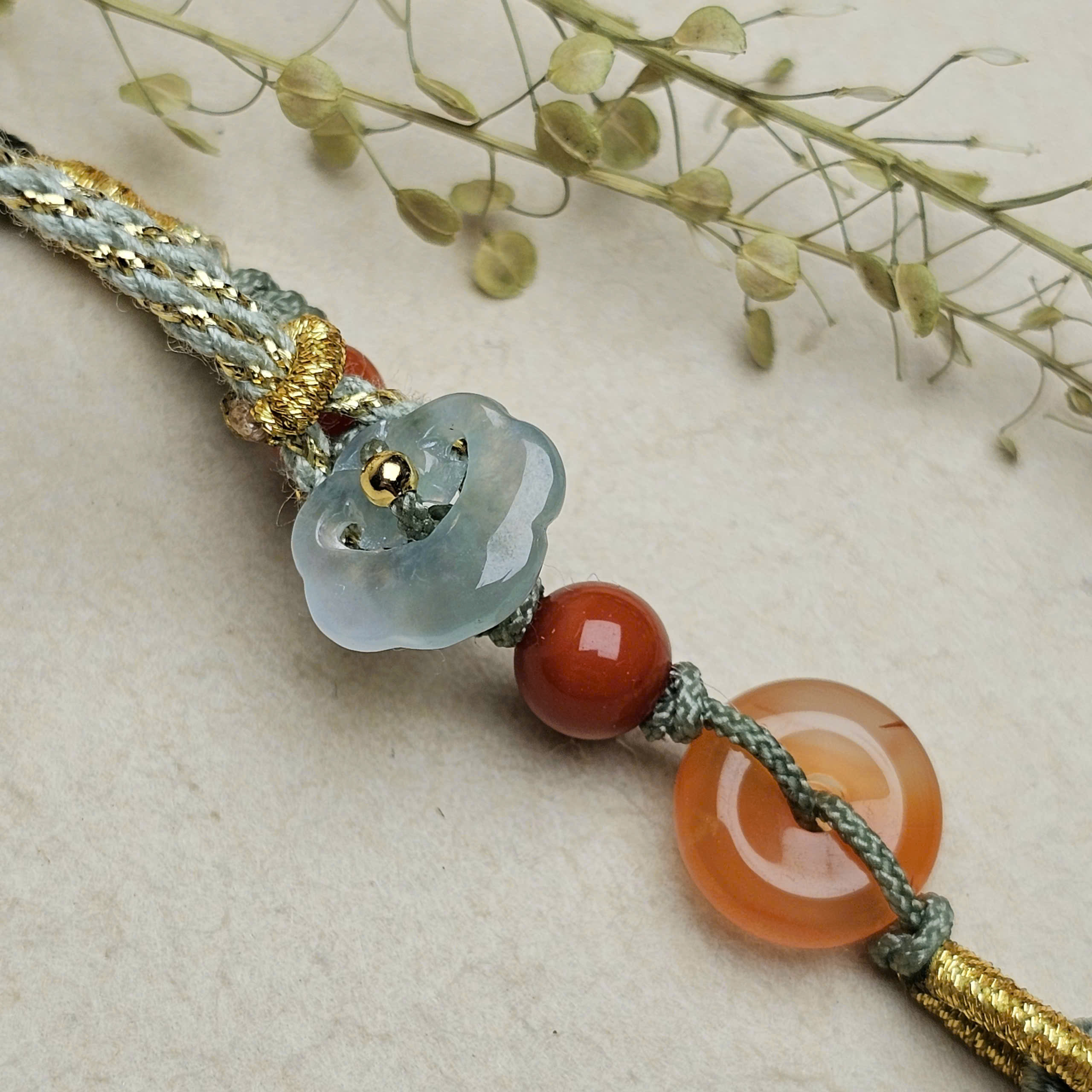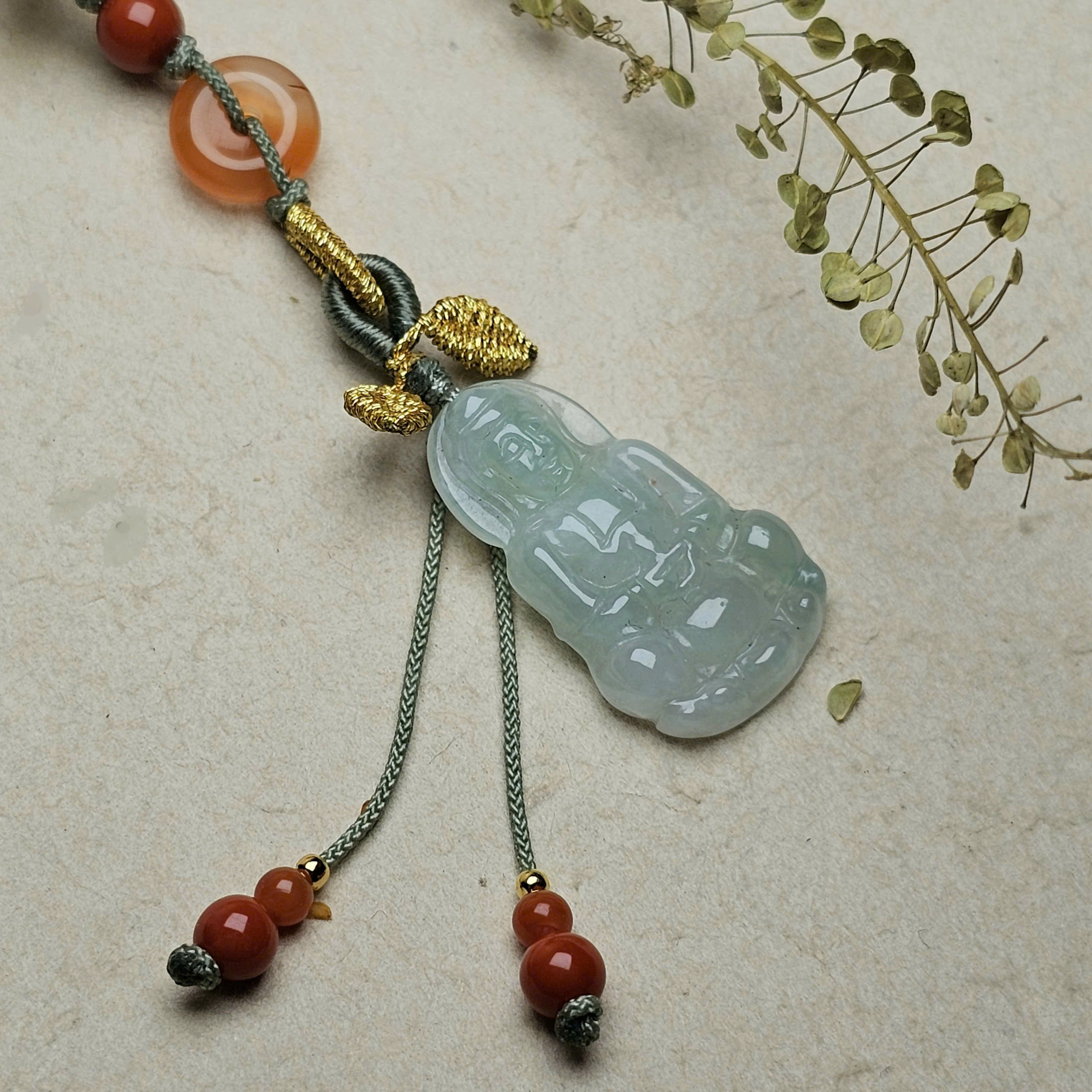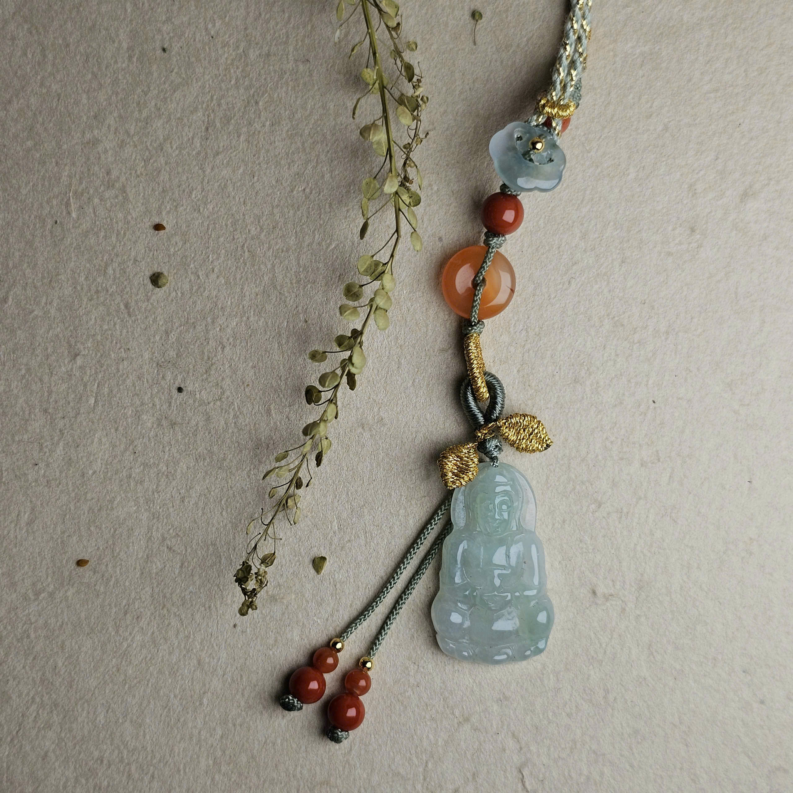 Móc treo túi phật và khóa trường mệnh Ngọc Jadeite type A mix khấu và hạt đỏ đặc Nam hồng. Có thể chuyển thành dây treo túi.
