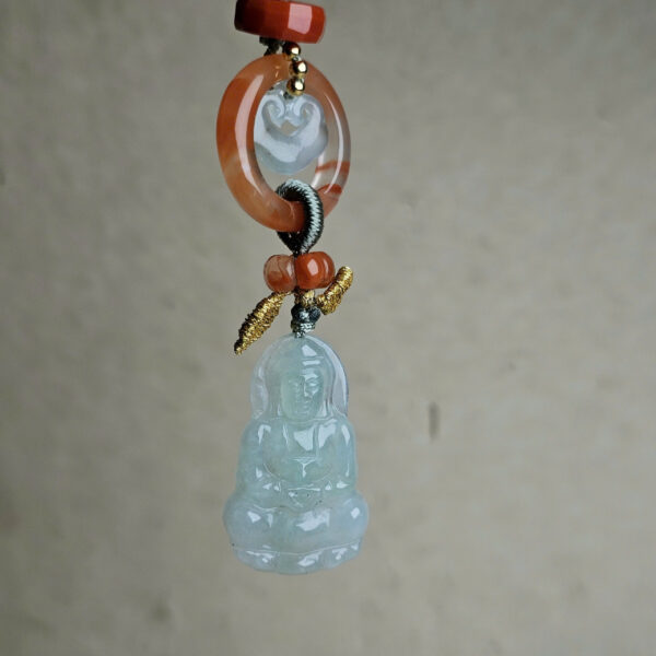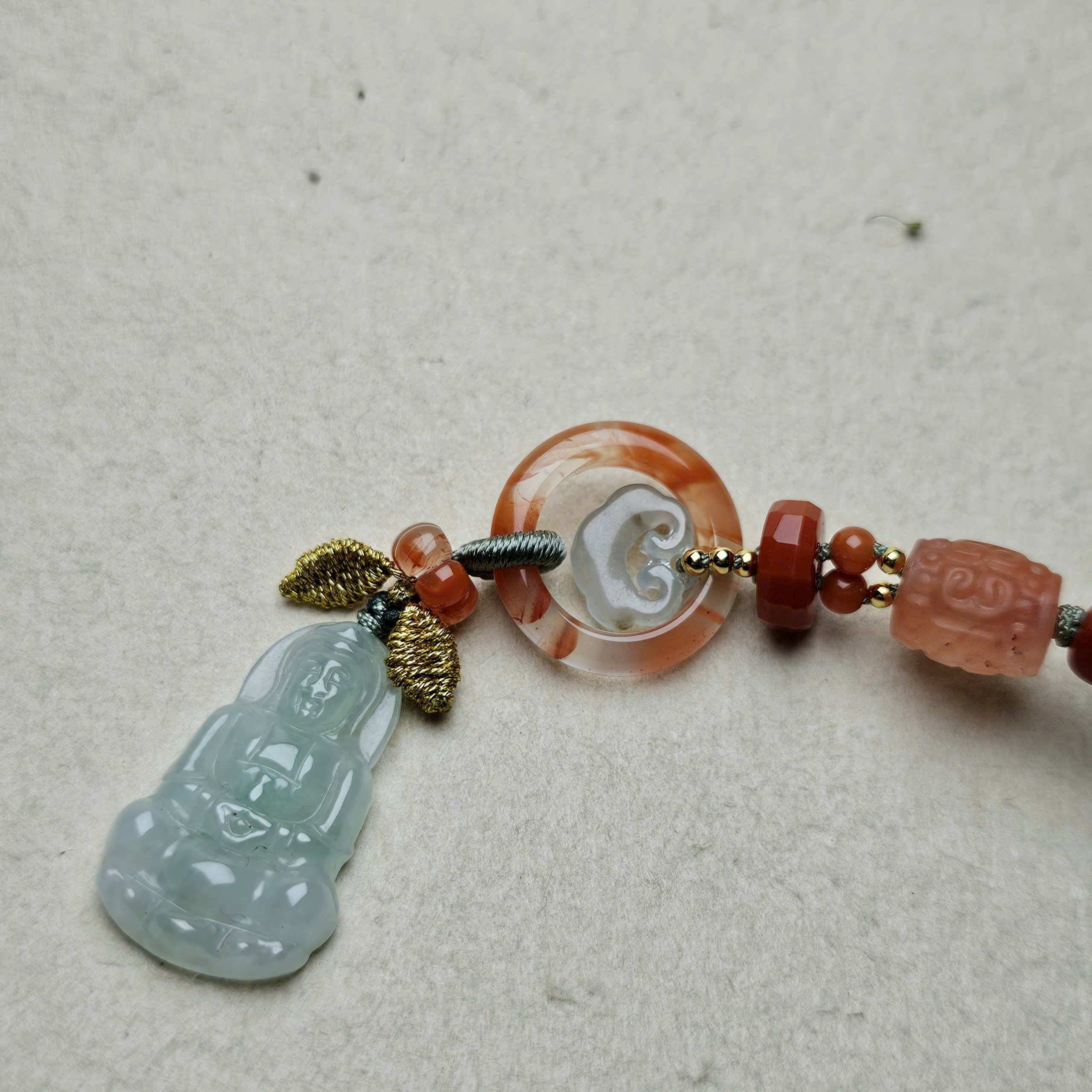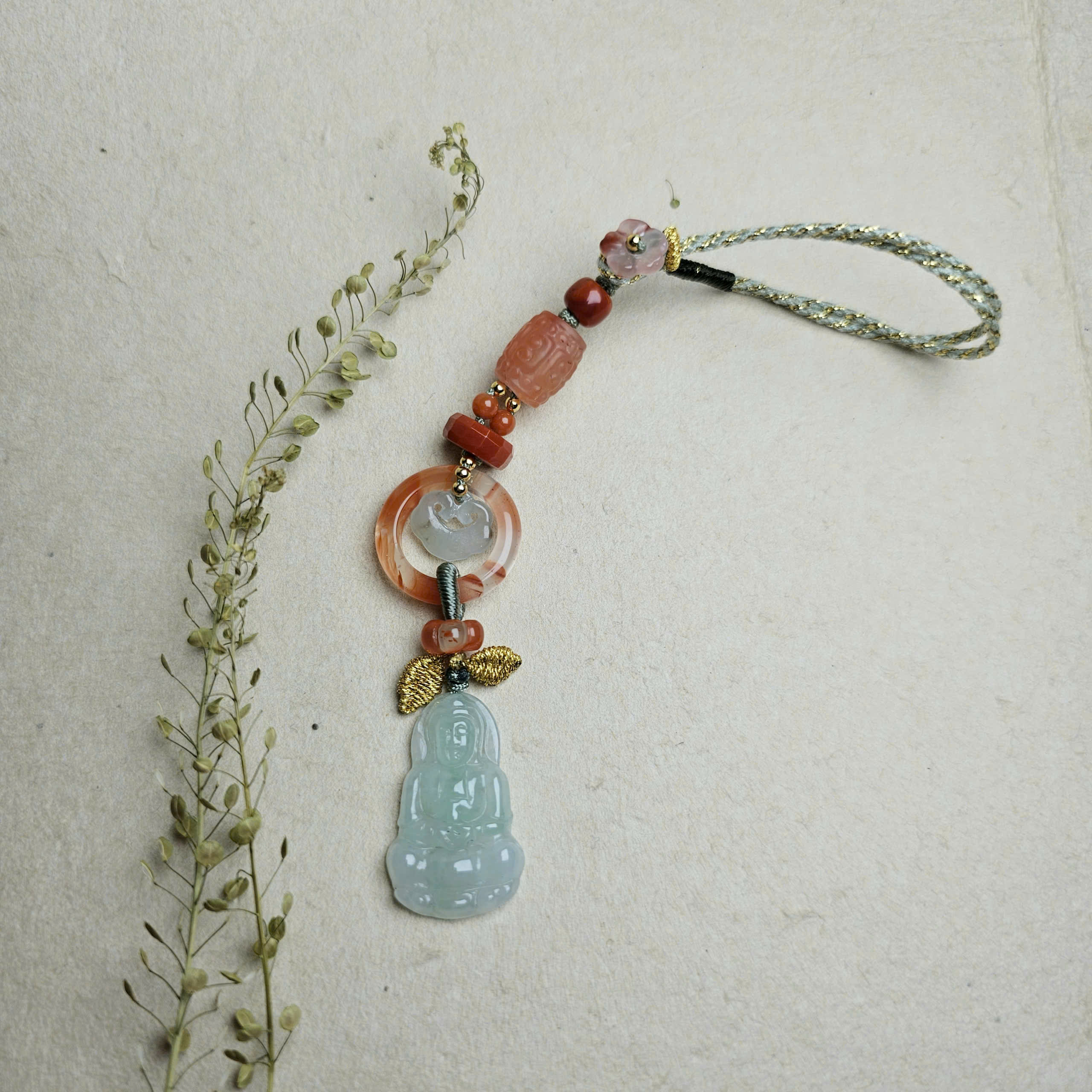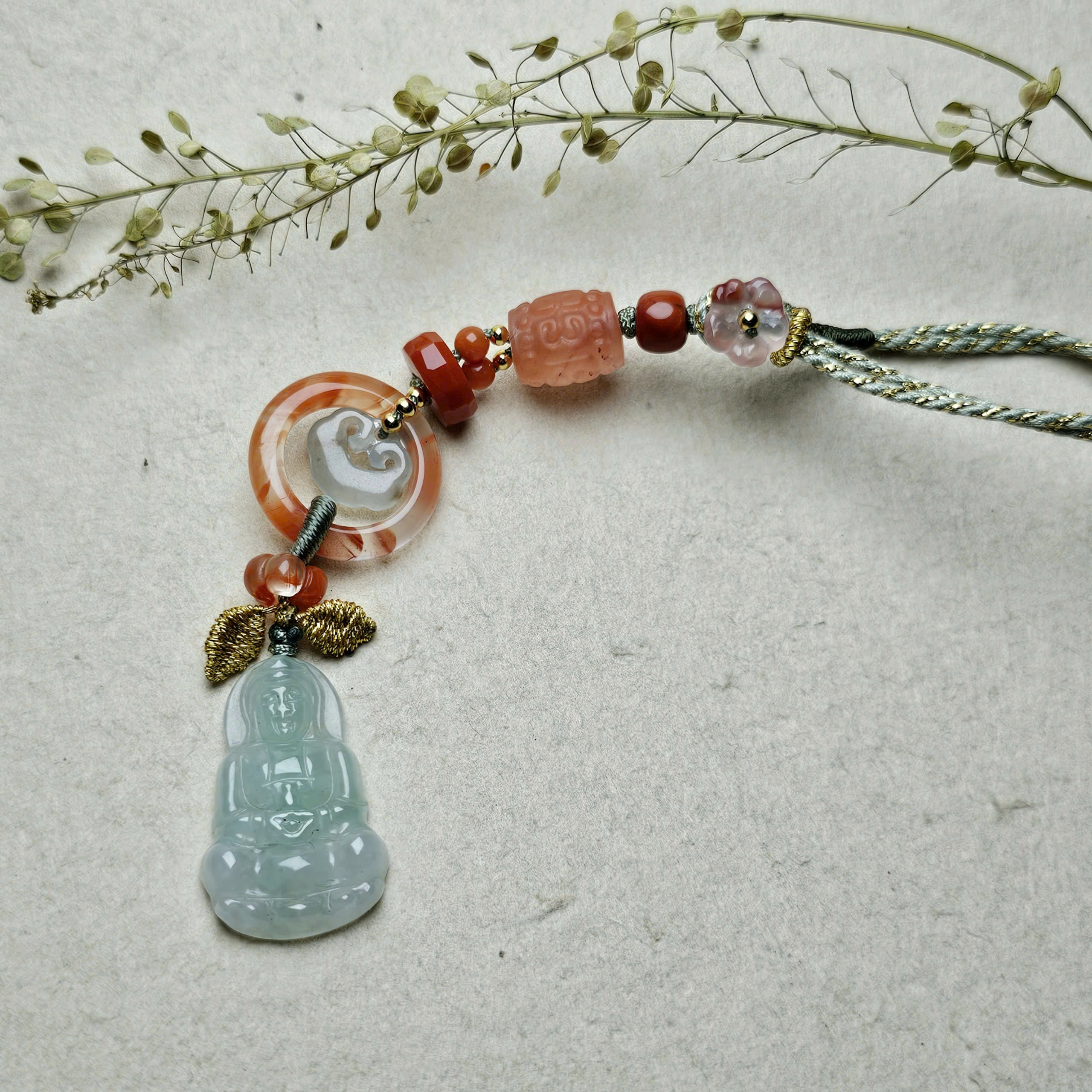 Móc treo túi phật và khóa trường mệnh Ngọc Jadedite type A mix khấu bình an, hoa, lu khắc hoa văn Nam hồng. Có thể chuyển thành dây treo điện thoại.