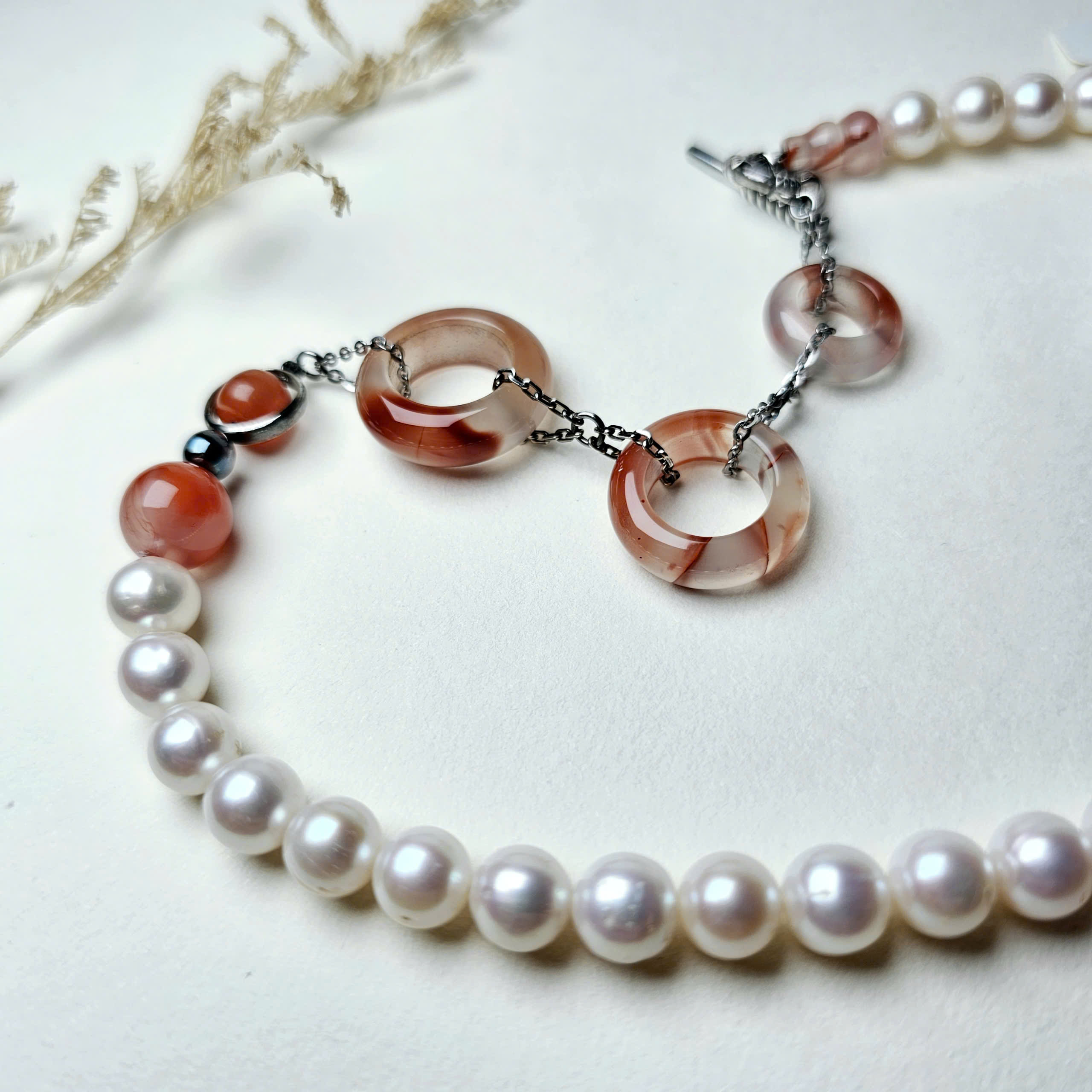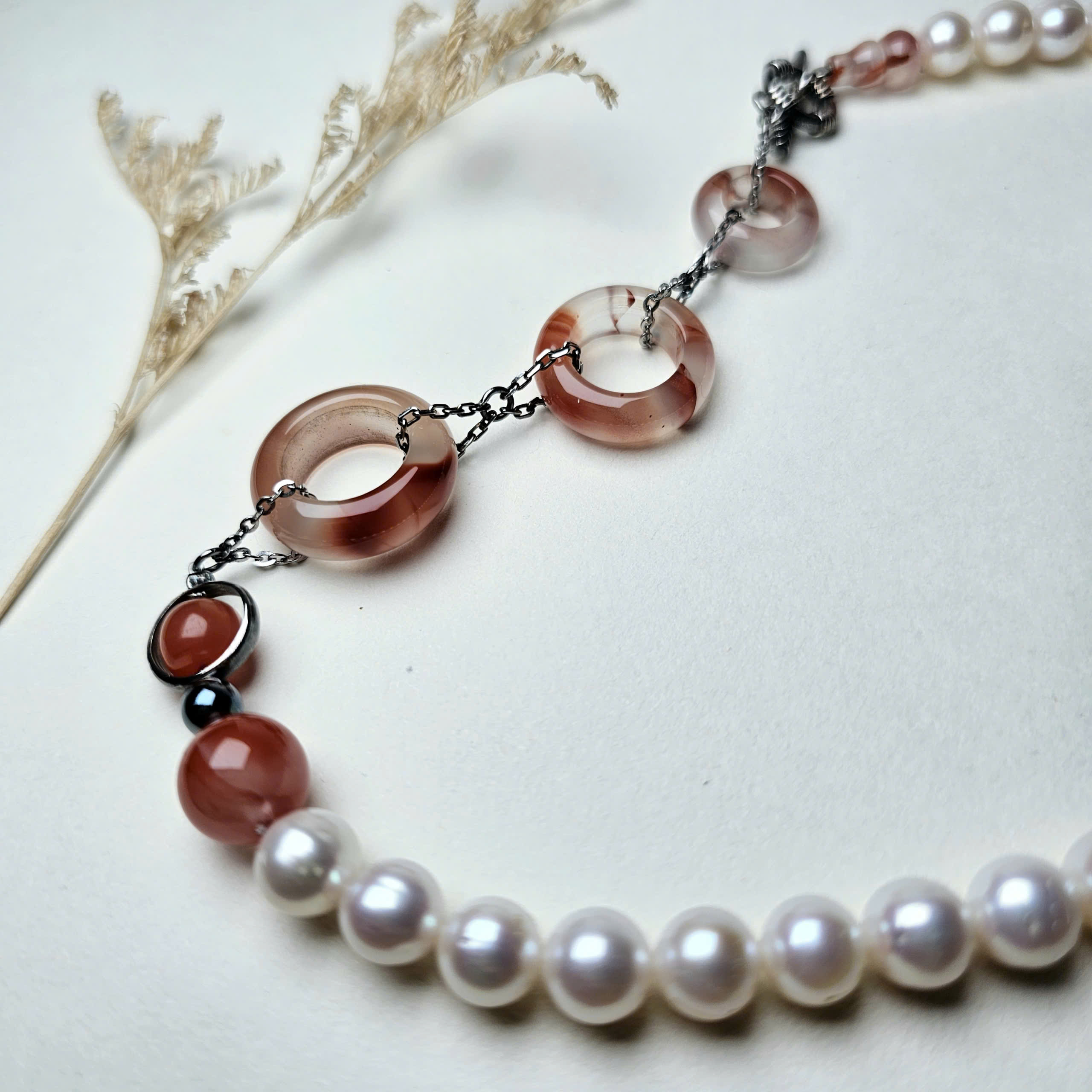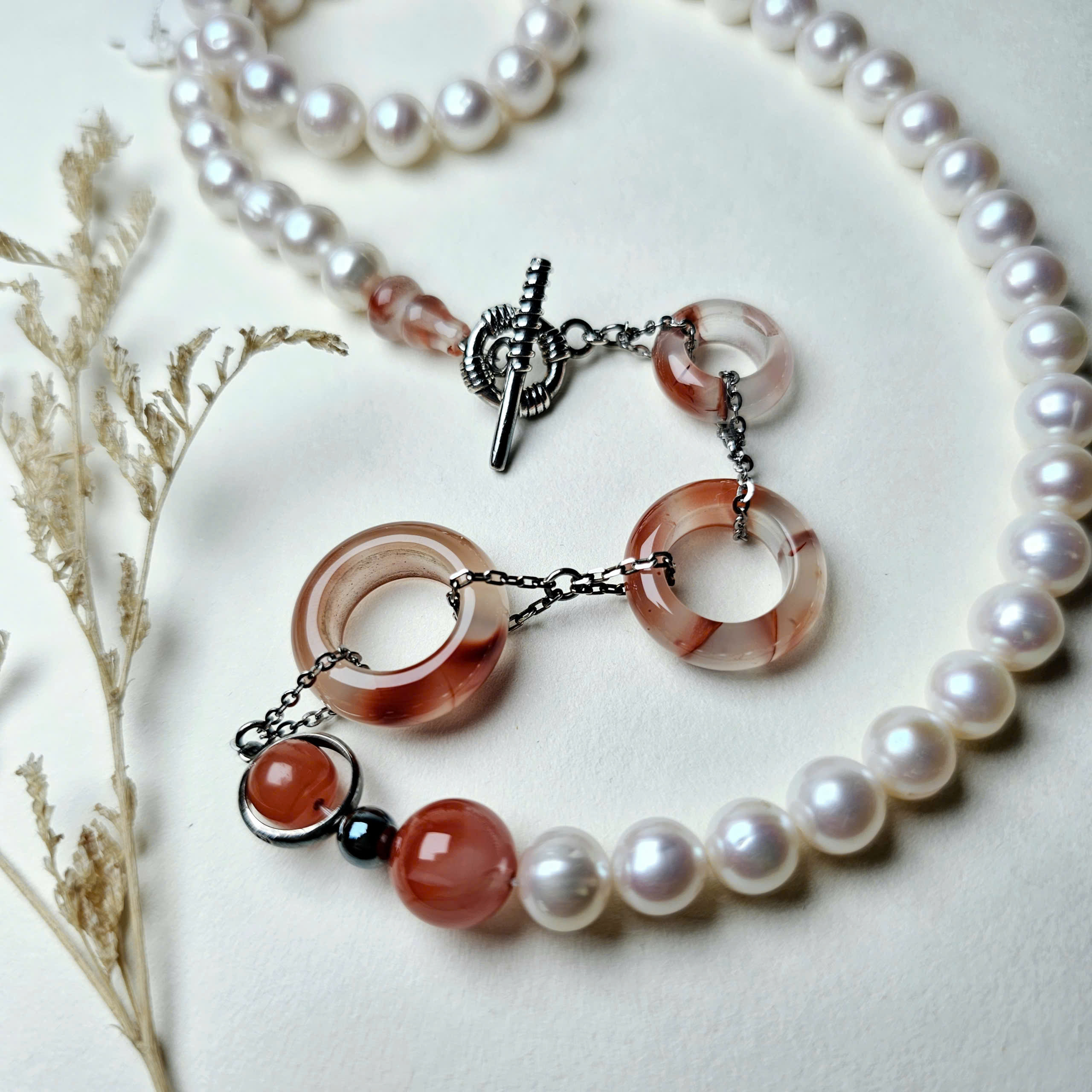 Sự kết hợp hoàn hảo giữa vẻ đẹp tinh khiết của những viên ngọc trai nước mặn 7.7ly và sự lấp lánh nhẹ nhàng của đá Nam Hồng. Những viên ngọc trai được tuyển chọn kỹ lưỡng, mang đến ánh sắc tự nhiên và độ tròn đều, tạo nên sự sang trọng và thanh lịch. Đá Nam Hồng, với sắc hồng dịu dàng, là điểm nhấn nổi bật, tăng thêm sự nữ tính và duyên dáng cho chiếc vòng. Sự kết hợp này tạo nên một món trang sức hoàn hảo cho mọi dịp, từ đi làm đến dự tiệc.
