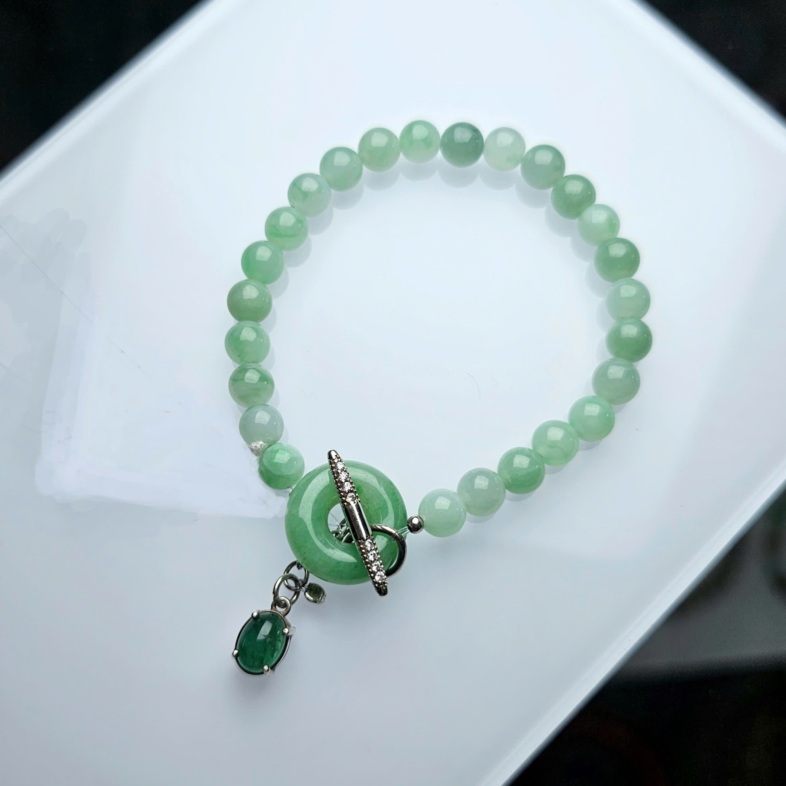 Vòng Ngọc táo Jadeite type A, khấu ngọc táo là điểm nhấn được khéo léo dùng thành phần khóa của chiếc vòng, charm treo Emerald bạc.