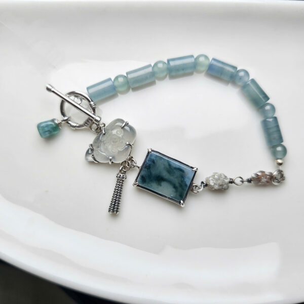Vòng tay ngọc Jadeite type A mix kim cương thô, khung bạc S925.