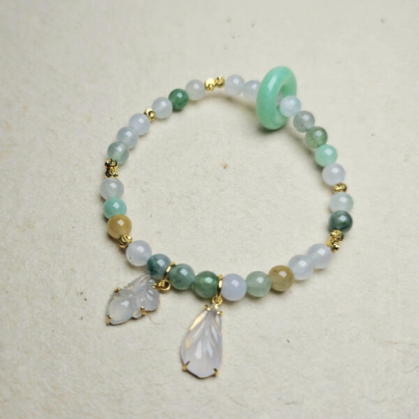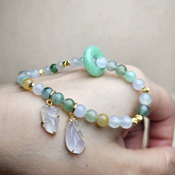 Vòng phỉ thúy đa sắc, mix charm thiên thần, lông vũ và khấu ngọc màu táo